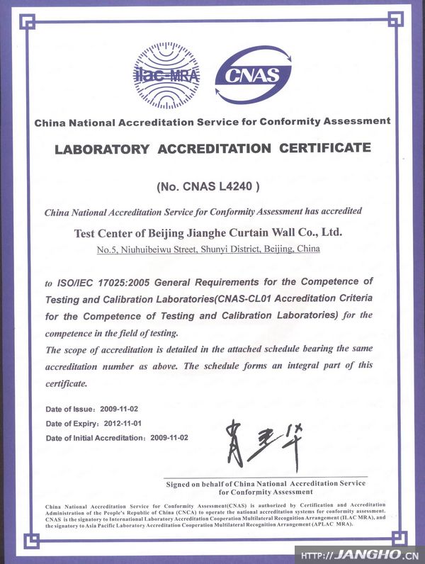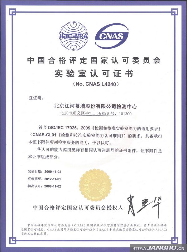 11月2日,,,,北京鉴黑担保网幕墙股份有限公司检测中心正式获得中国及格评定国家认可委员会CNAS实验室揭晓的认可资质证书,,,,标记着鉴黑担保网幕墙检测中心顺遂通过了国际ISO17025标准的认可,,,,综合检测能力获得行业组织的国家认可,,,,成为海内幕墙企业首家通过CNAS评审的出口企业检测中心,,,,并乐成列入国家获准实验室认可机构名录。。。。。。以后,,,,检测中心可在认可检测规模内使用CNAS实验室认可标记和ILAC国际互认联合标记,,,,并有时机加入国际及格评定机构认可双边、多边相助交流。。。。。。